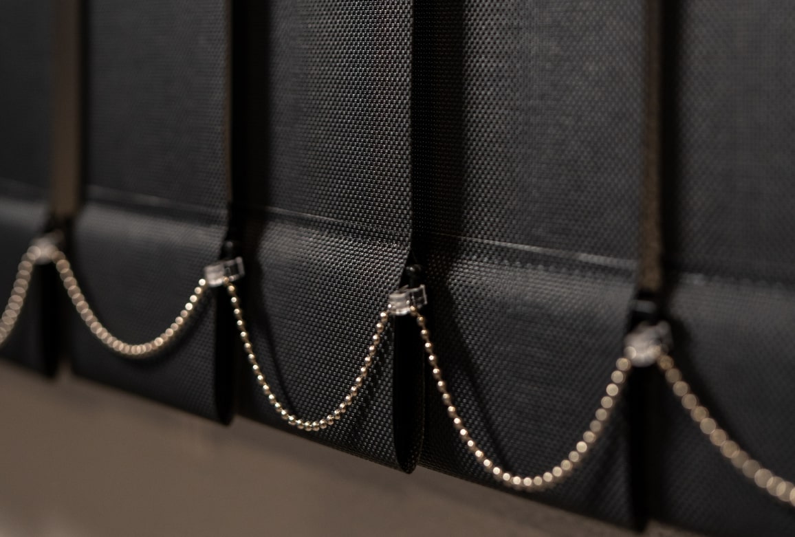 Усі елементи системи — від карниза до нижнього ланцюжка — виконані в одному кольорі, total black. Дизайнерська ідея дає чисту лінію вікна й не розбиває вигляд вікна на дрібні деталі. Чорне рішення в цьому проєкті підтримує тканину скріну й формує акуратний контур, який легко читається на великій площині.