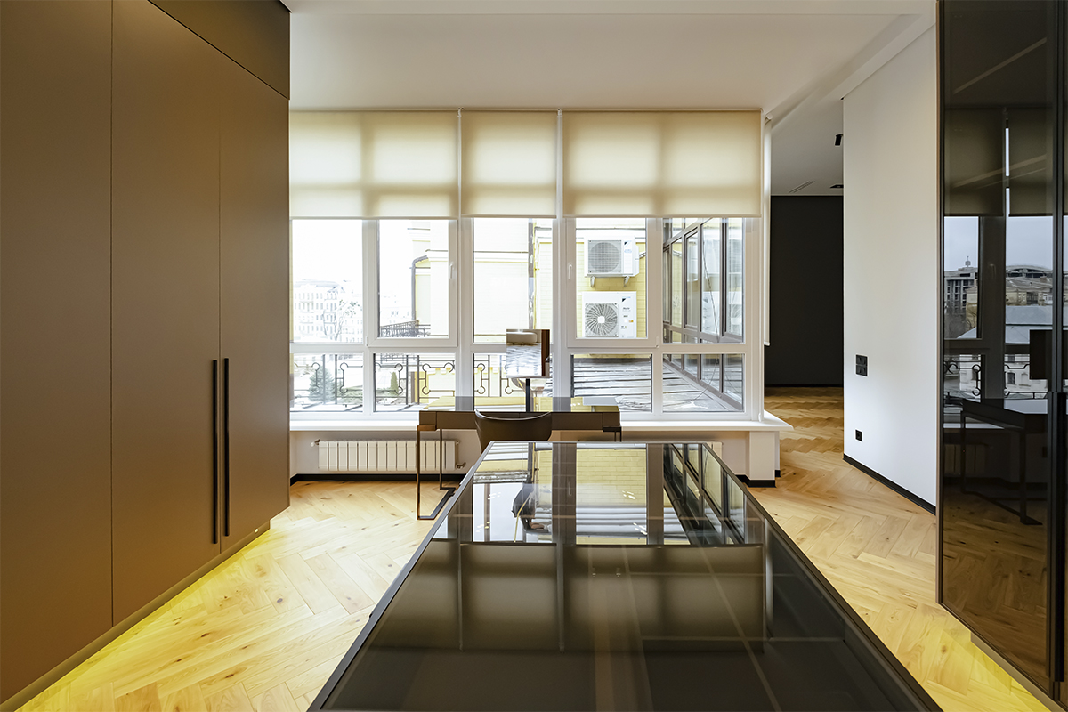 Оптичне збільшення простору. Саме завдяки своїй мінімалістичній конструкції, відкриті рулонні штори не створюють відчуття громіздкості у кімнаті. Вони повністю не закривають віконний отвір, це дозволяє кімнаті здаватися світлішою та просторішою, зокрема в смартквартирах Києва доречно.