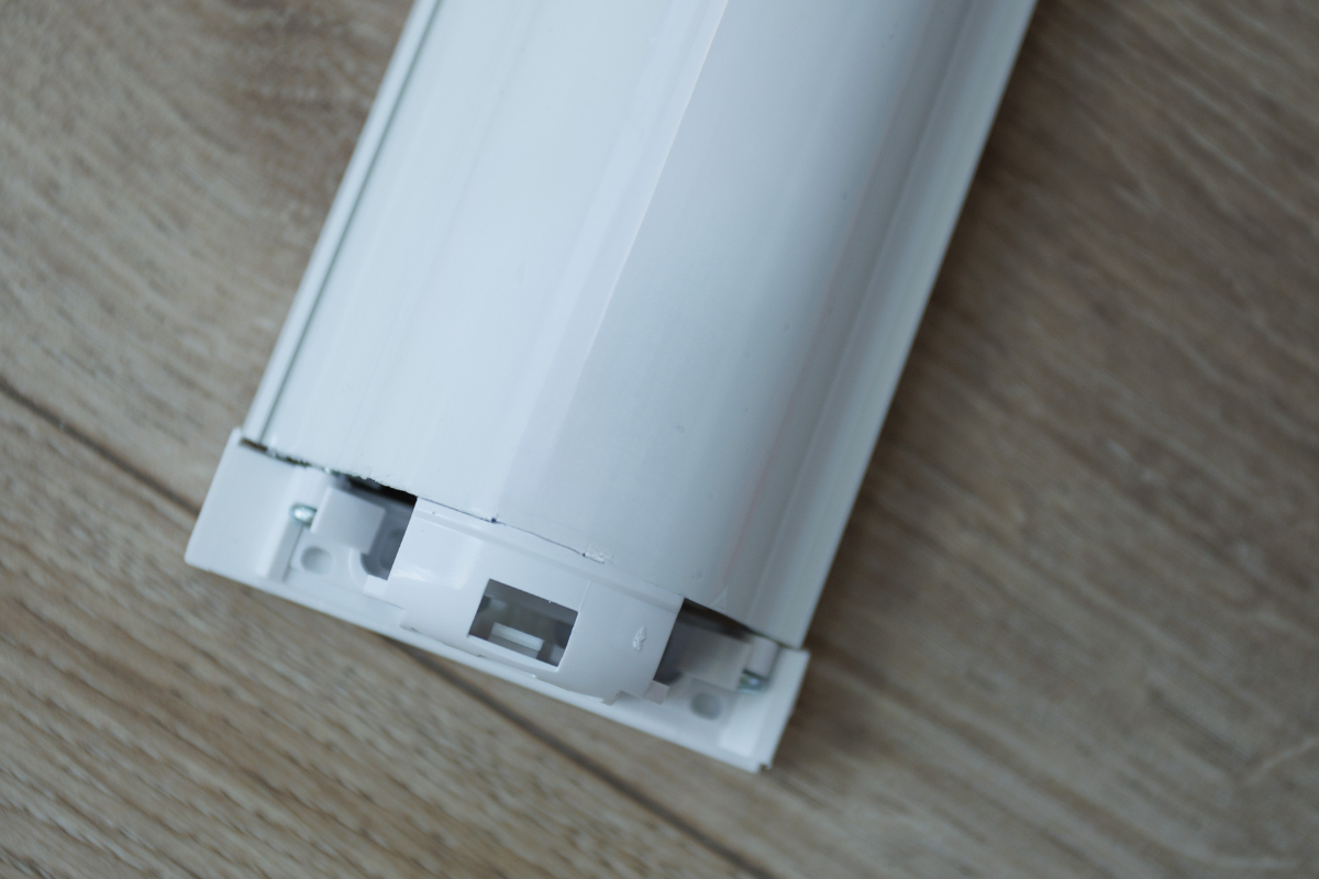 Касета-короб закриває вал із тканиною. Це далеко не лише естетично гарно. Важливо, що є захист від пилу і механічних пошкоджень. У нижній частині рольштори кріпиться нижня планка, завдяки чому полотно ідеально рівненьке у розгорнутому стані (ніяких хвиль і зморшок).