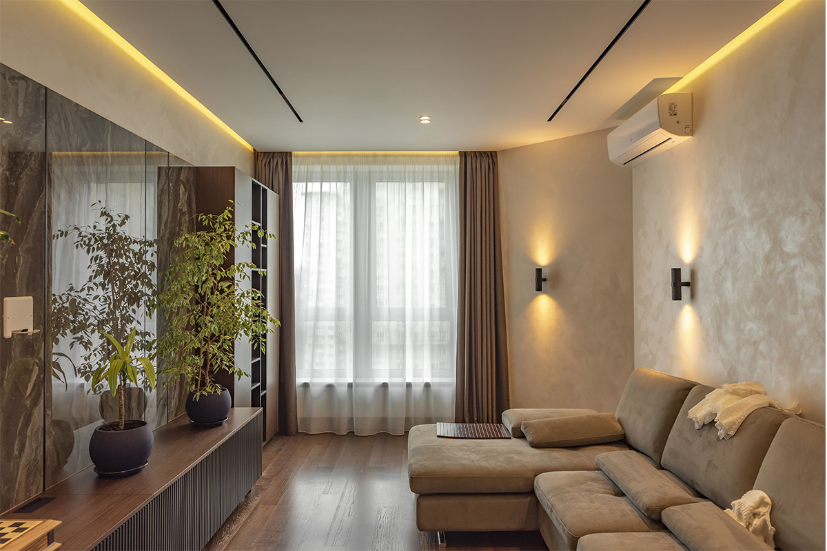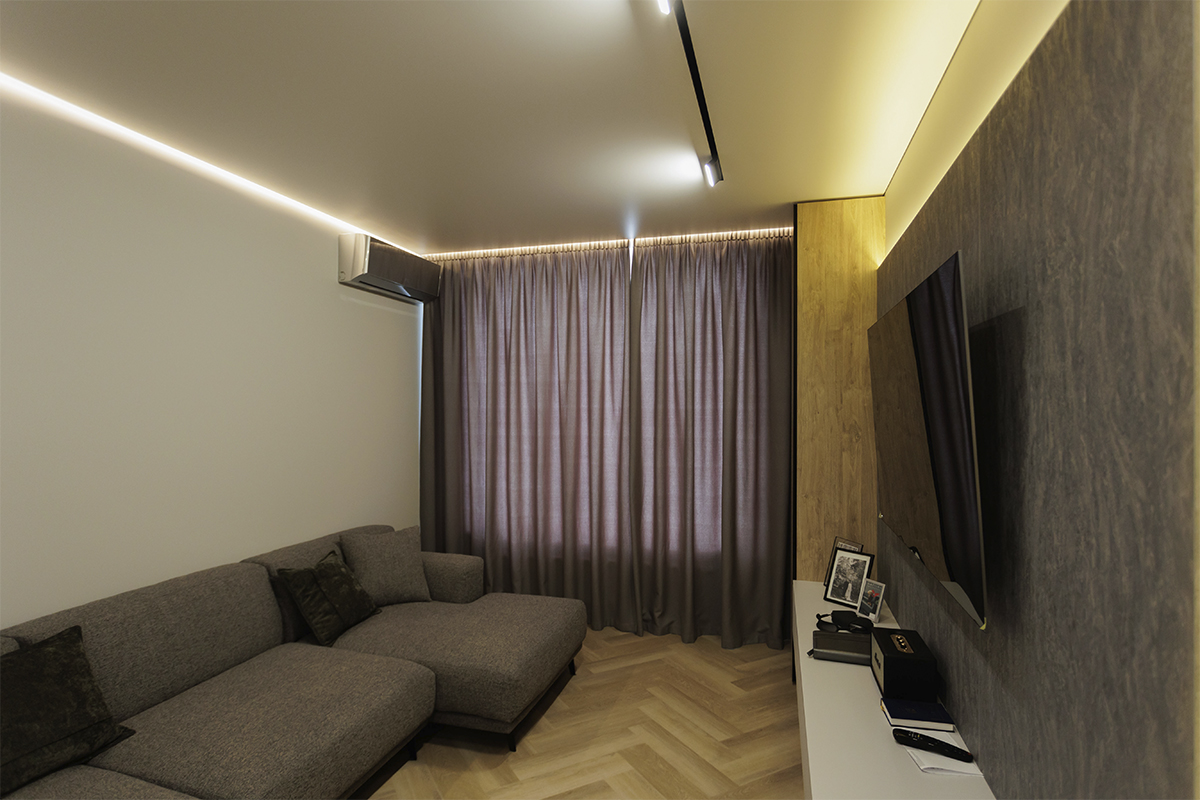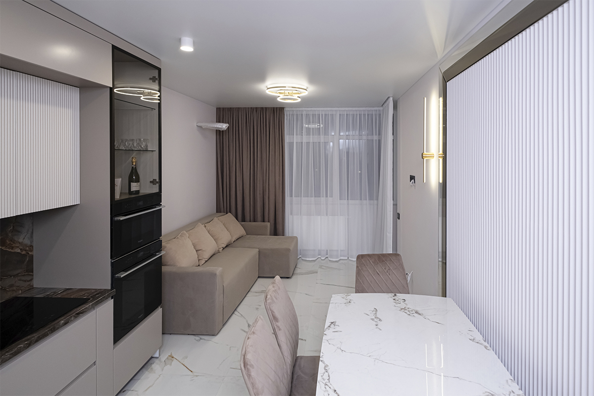 - світло-сірий — м’яко гармонізує з горіховим тоном, зберігає баланс між теплом і прохолодою в інтер’єрах Києва;