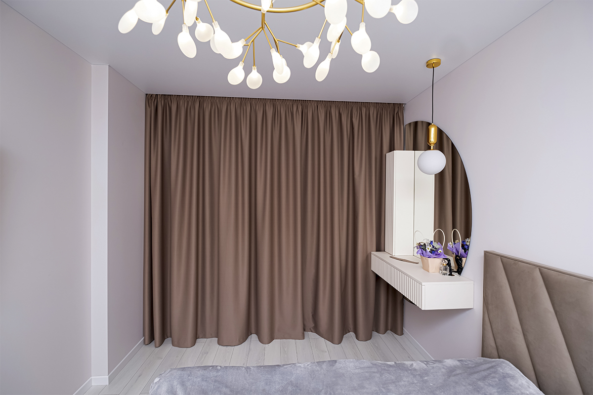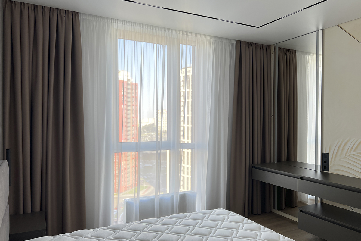 Коричневі фіранки з легкістю створюють ефект затемнення. Ваша спальня буде вдячна, а ви щоразу перед сном будете радіти рішенню купити сонцезахист, адже ні природне світло, ні ліхтарі з вулиць Києва – ніщо не потривожить ваш сон і відпочинок.